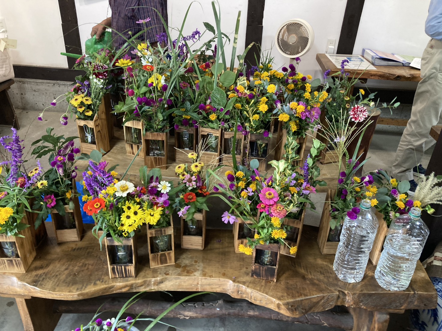 色とりどりの秋の花がたくさん集まりました。ボランティアの皆さんのご協力で一つ一つ丁寧に束をつくり、90個の一輪挿しに飾ります。