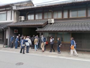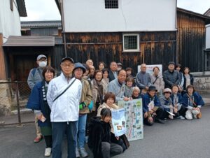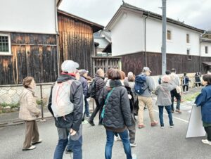 まず、可笑屋で、可部の歴史に詳しい辻村さんによる座学、その後、夢街道沿いにお住いの福田さん、天野さん、佐伯さん、西村さんのご協力により可笑屋周辺の見どころを皆さんでめぐりました。今回は、日頃見ることができない 旧貯蓄銀行の倉庫や旧西村醤油さんの蔵の見学をさせていただくことができました。