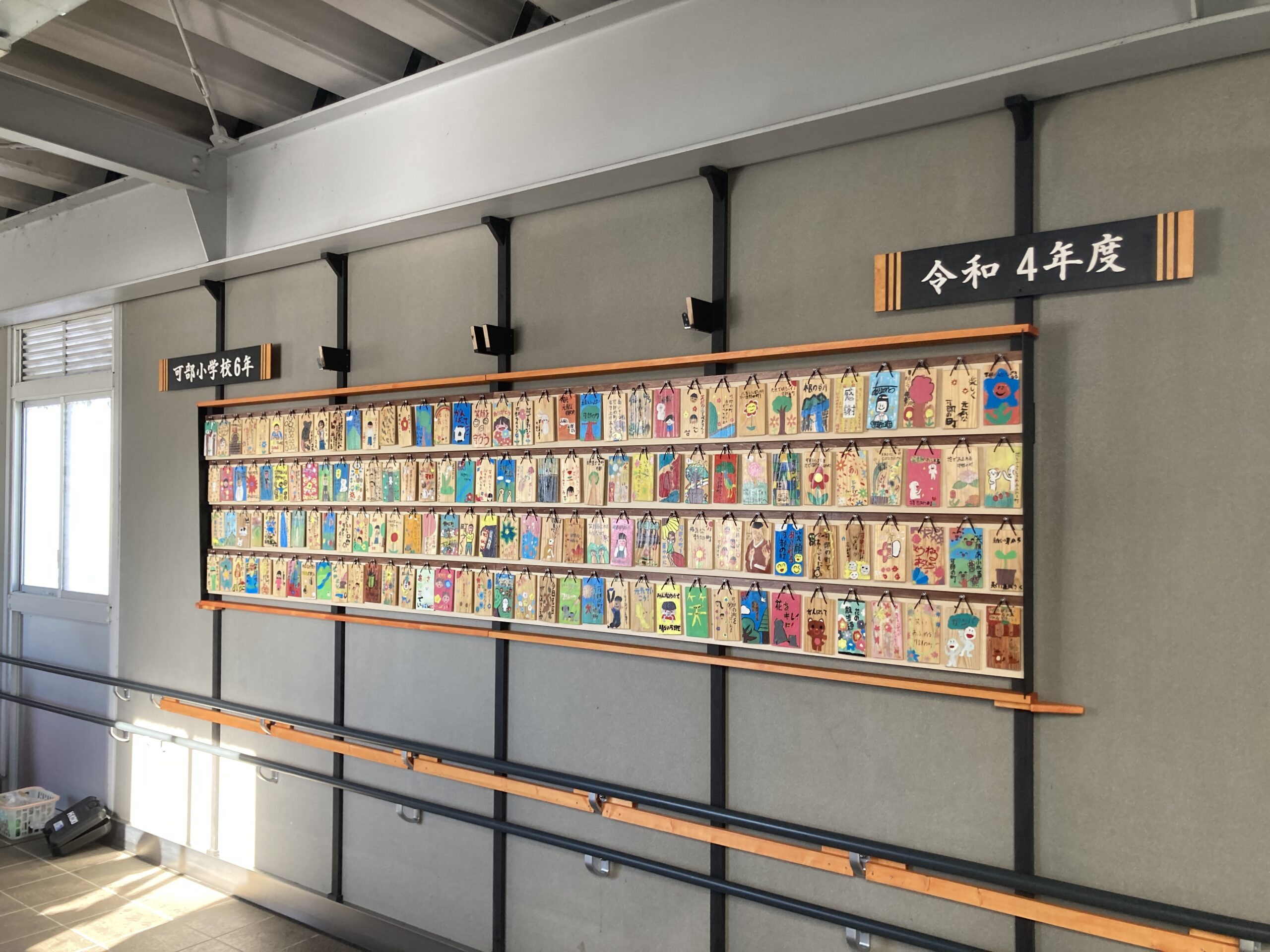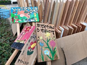 令和4年度には「私の好きな可部の町」と題して、可部小学校6年生が木札に自分たちの可部に対する願いや思いなどを描きそれを展示しています。(毎年更新)