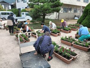 ボランティアの皆さんの手際の良い作業で、短い時間で65個のプランターにナデシコの花がきれいに並びました。